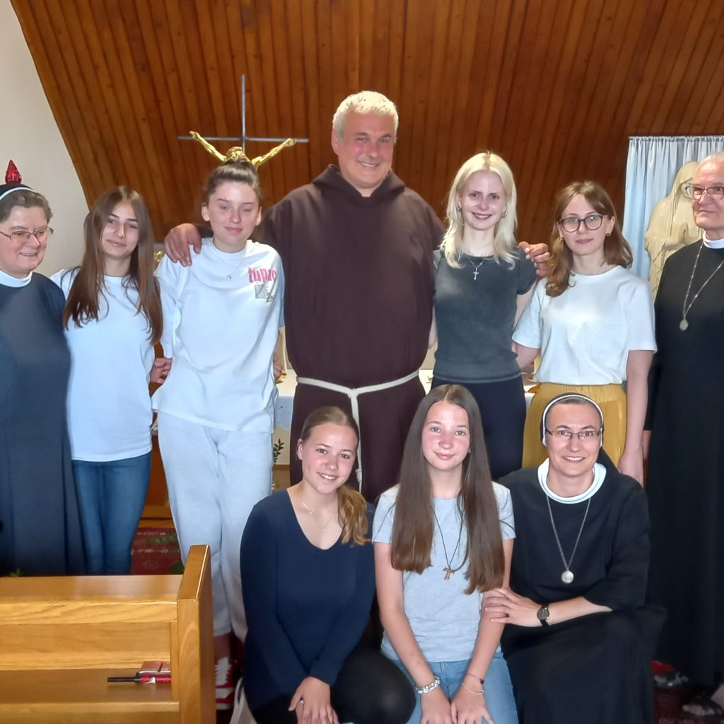 Početkom mjeseca lipnja, sestre su organizirale vikend u samostanu za djevojke od sedmog razreda. Plakate smo podijelili na nekoliko zagrebačkih župa. Odazvalo se šest djevojaka, među njima i dvije koje pohađaju fax. U petak u večernjim satima, našim kombijem uputili smo se do prijavljenih djevojaka. Došli smo po njih pred njihove kuće. Uzbuđenje je bilo obostrano. Dirljivo je bilo gledati ispraćaj njihove obitelji. Žele vidjeti kamo idu njihove djevojke. Djevojke su se raspričale u kombiju kao da se oduvijek poznaju. Spontanost i prihvaćenost. Osluškivale smo njihove razgovore i povremeno trebalo je odgovoriti na njihova znatiželjna pitanja. Pred dolazak u glavnu kuću sestre su nas dočekale raširenih ruku. Prvo večera, omiljeni mladenački specijaliteti. Zatim slijedi spavanje. Spremne sobe čekaju, ali one bi najradije sve u jednu sobu. Ipak smo se uspjeli dogovoriti, da svi budu zadovoljni. Sutradan sve na nogama u ranim satima. Premda nenaspavane, slijedila je jutarnja molitva u samostanskoj kapelici. Doručak u drugoj kući, veseli ih prelazak iz kuće u kuću. Djevojke su dosta otvorene. Kao da su nas tjerale da što prije počnemo sa programom. I tako je i išlo. Dan smo započeli sa svetom Misom u našoj kapelici, koju je predslavio fra Mišo Biskup. S. Anica ima svoj program u subotu do podne. Dosta aktivno sudjeluju u programu. U poslijepodnevnim satima, nakon pauze, preuzima ih s. Marina. Prezentacija popraćena fotografijama. Uključuje se one u diskusiju nakon prezentacije. Nakon kraće pauze uputili smo se u kapelicu na molitvu, sestre i djevojke. Njima je to prvo iskustvo moljenja časoslova i drugih molitava sa redovnicama. Sve teče u najboljem redu, kao da su oduvijek sa nama molile. Sad opet večera. Program je malo stisnut, jer bi htjeli da sve teče prema programu. Valjalo je gledati nogometnu utakmicu i žustro navijati za našu Hrvatsku. Djevojke se opustile, pjevaju, navijaju, ne ide se nikome iz dvorane. Ali nas je čeka ručni rad. Željele smo da si svaka djevojka izradi narukvicu sama za sebe. Učili smo ih tom poslu i na kraju su bile oduševljene, jer nose narukvicu koju su same napravile. Valjalo je poći na počinak. Djevojke nisu umorne, dugu u noć prepričavaju protekli dan. Osvanula je nedjelja. Zajednički pošli smo na svetu misu kod naših franjevaca kapucina. Uslijedio je doručak. Novi program do podne preuzima s. Katarina. Prezentacija o osobnom pozivu u redovnički život, popraćena fotografijama. Na kraju podijelila im je nekoliko pitanja na koja su mogli pismeno odgovoriti. Dale su se one na ozbiljno pisanje. Slijedila je kratka pauza. Pošli smo onda na zajedničku molitvu i slijedi svečani ručak. Sestre i djevojke. Opraštamo se jedni s drugima. Djevojkama je teško krenuti nazad, rado bi još ostale. Samo neka njihova zapažanja: „Bilo nam je lijepo“. „Jako je brzo završilo“. „Kad ćemo opet moći doći“. „I ja bih htjela biti kao vi„. „ Doći ćemo vas posjetiti samo onako“. „ Ja bih još ostala“. Uslijedio je oproštaj sa djevojkama. Žalosne su one a i mi sestre jer pomladile su samostan svojim kratkim boravkom. I opet svi sjedamo u kombi, vozimo se do Mlake, Lomnice, Gradića i Velike Gorice. Red je sve vratiti njihovim kućama. Do sljedećeg susreta, neka nas sve prati zagovor blažene Djevice Marije Kraljice svijeta.